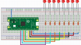 白いLEDを7個、赤いLEDを4個、明るいLED(に見立てた白いLED)を1個、順に点灯させたのでコード覚え書きですfrom machine import Pinfrom time import sleepSLEEP_TIME = 0.33...
